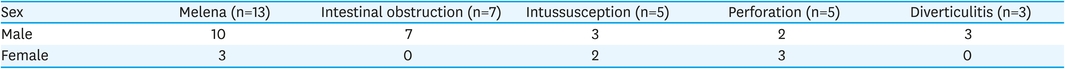 Twenty-five cases occurred in boys and 8 cases occurred in girls, with a male to female ratio of 3.1:1. The sex distribution according to the presentations was prevalent in men in the case of melena, intestinal obstruction, and diverticulitis, but there was no difference between men and women in the case of intussusception and perforation. At the time of diagnosis, the age ranged from 6 months to 17 years, with an average of 92.4 months. In the age distribution, 6 patients (18.2%) were under 1 year of age, 6 patients (18.2%) were 1 to 5 years of age, and 21 patients (63.6%) were older than 5 years old. The mean age according to the presentations was 7.2 years, 9.2 years, 6.8 years, 8.4 years, and 6.8 years in melena, intestinal obstruction, intussusception, perforation and diverticulitis, respectively. Tables 1 and 2 summarized the sex and age distribution according to the clinical presentation.