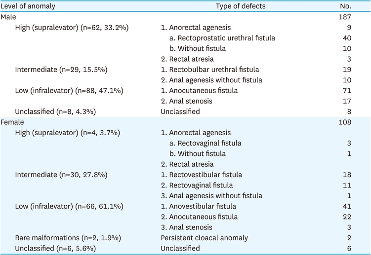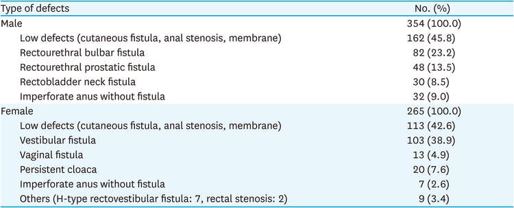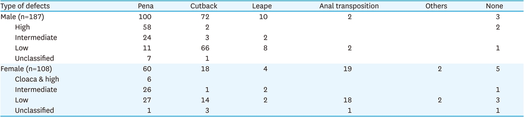 In our two national surveys of KAPS, the second national survey using Wingspread classification enrolled 295 patients over 2 years. Six hundred nineteen patients were enrolled in the third national survey with Peña classification over 4 years. Although the number of patients per year was similar in the two national surveys, it was difficult to directly compare the demographics and type of defects between two national surveys due to the difference in classifications used. Nevertheless, in the 2 national surveys, the most common type among male and female was the low type in the second national survey, and low defects (cutaneous fistula, anal stenosis, membrane) in the third national survey.