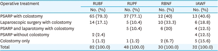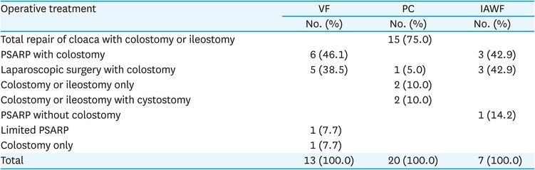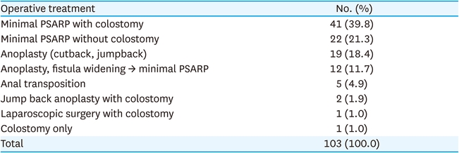 For the low defects in female patient, 89 cases (78.8%) were treated with anoplasty and minimal PSARP were performed in 18 cases (15.9%) (Table 8). For vestibular fistula, various surgical options were performed: 41 cases (39.8%) were minimal PSARP with colostomy, 22 cases (21.3%) were minimal PSARP without colostomy, 19 cases (18.4%) were anoplasty, and 12 cases (11.7%) were anoplasty or fistula widening and then minimal PSARP (Table 9). For vaginal fistula, PSARP with colostomy were performed in 6 cases (46.1%) and laparoscopic surgery with colostomy were performed in 5 cases (38.5%). For persistent cloacas, 15 cases (75.0%) were treated with total repair of cloacas with colostomy or ileostomy and 2 cases (10.0%) were performed with colostomy or ileostomy only. Two cases (10.0%) were performed with colostomy or ileostomy with cystostomy (Table 10). Other cases included 7 cases of H-type rectovestibular fistula which were treated with mucosal advancement flap and 2 cases of rectal stenosis which were treated with PSARP with colostomy or pull-through operation with ileostomy.