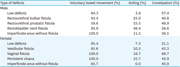 Regarding the postoperative functional outcomes in male patients, low defects resulted in 94.3% having voluntary bowel movements, 3.8% had soiling, and 27.4% had constipation. However, in rectourethral prostatic fistula, as we could expect, the outcome was poor compared to the low type. 59.6% had voluntary bowel movements, 25.5% had soiling, and 48.9% had constipation. Regarding the postoperative functional outcomes according to the type of defects in female patients, low defects resulted in 95.4% having voluntary bowel movements, 7.3% had soiling, and 21.1% had constipation. For vestibular fistula, 10.3% had soiling, and 43.3% had constipation. For vaginal fistula, 16.7% had soiling, and 66.7% had constipation. For cloacas, 35.7% had soiling, and 42.9% had constipation (Table 11).