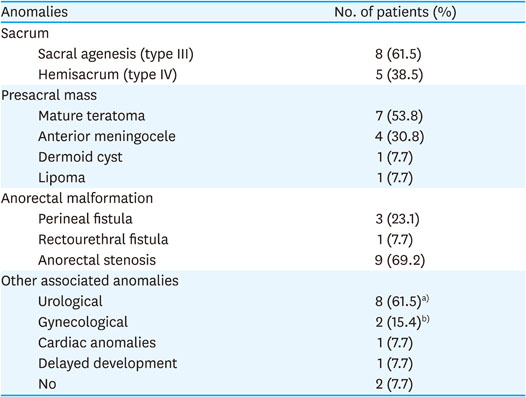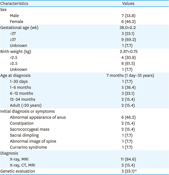 No significant difference in disease prevalence was observed in terms of sex (male:female, 7:6), and the median age at diagnosis was 7 months (1 day to 35 years). Currarino syndrome was diagnosed during the neonatal period in only one patient, whereas its diagnosis was delayed in the other patients. The most common initial symptom or diagnosis was anorectal malformation (ARM) followed by constipation and sacrococcygeal mass. All patients underwent simple abdominal X-ray and magnetic resonance imaging for the diagnosis of this disease. The most common sacral anomaly was partial sacral agenesis (type III, 62%) followed by hemisacrum (type IV, 38%). The most common presacral mass was mature teratoma. No pathologic malignant features were observed. In ARM, nine patients had anal stenosis, and posterior sagittal anorectoplasty was the most common operative method for ARM. Twelve patients were followed up beyond the age of three, and the median follow-up age was 8.1 years (range: 3.1–30.0 years). Among the 12 patients, 4 patients did not show symptoms of functional abnormality, whereas 8 patients showed constipation, fecal incontinence, urinary dysfunction, or gait disturbance.