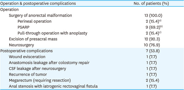 The purpose of the surgical treatment of Currarino syndrome is considerably straightforward, but we performed various surgical treatment sequences depending on the diagnostic sequence of Currarino syndrome. However, when possible, the co-operation of ARM and excision of presacral mass is a good treatment option. More than half of cases underwent PSARP and excision of presacral mass simultaneously, and no complication related to this co-operation occurred. However, we found various kinds of postoperative complications in seven patients, including wound evisceration, anastomosis leakage after colostomy repair, CSF leakage after neurosurgery, and recurrence of presacral teratoma, megarectum, and anal stenosis with iatrogenic rectovaginal fistula. We presume that the complex anomalies and rarity of this syndrome contributed to the high incidence of and to the different kinds of complications.