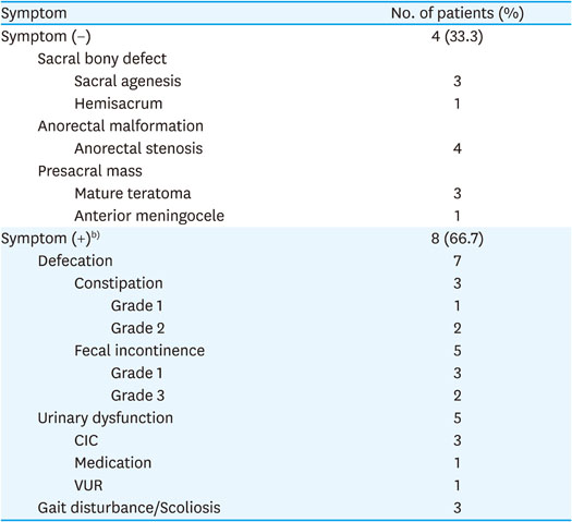Among the 12 patients, 4 patients did not show symptoms of functional abnormality, whereas 8 patients experienced constipation, fecal incontinence, urinary dysfunction, or gait disturbance. Seven of these eight patients had a defecation problem. Moreover, 3 patients had constipation, 5 had fecal incontinence, including 1 patient who had both symptoms. All constipation cases were classified as grade 1 or 2 and could be managed with laxatives. However, of the five patients with fecal incontinence, two had grade 3 soiling and ultimately underwent antegrade continence enema (ACE) procedures.