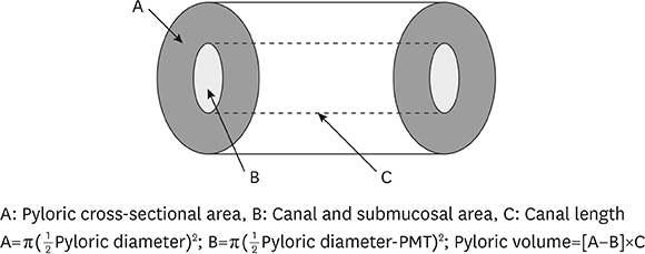 For volumetric analysis of pylorus, PV was calculated to visualize the amount of hypertrophy. The volume of the pylorus was estimated by calculation of the volume of a pipe (Fig. 2). The volume of the lumen was estimated by calculation of the inner cylinder of the pylorus model.