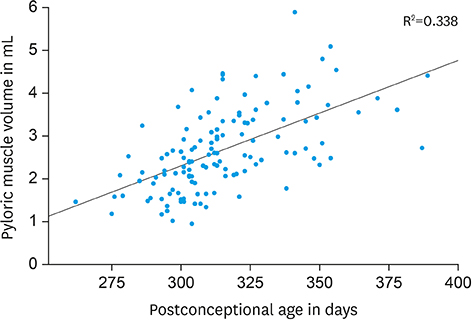 PV was suggested as a possible diagnostic criteria decades ago while it was not popularized due to the complexness of its calculation and possible errors in measuring the dynamic shape of the pylorus. Mean PV of all patients in this cohort was 2.67±0.97 mL, which was similar to the study reported by Rohrschneider et al. [9], showing mean PV of 2.7±1.1 mL in patients and 0.6±0.3 mL in normal group. Simplifying the curved pipe to a straight pipe, Westra et al. [14] suggested a cutoff value of 1.4 mL to confirm the diagnosis of IHPS. According to our result, the least value of pyloric muscular volume was 0.95 mL, and while 94.7% of the patients met Westra's criteria, 5.3% of the patients still did not match, whose postconceptional age were under 310 days.