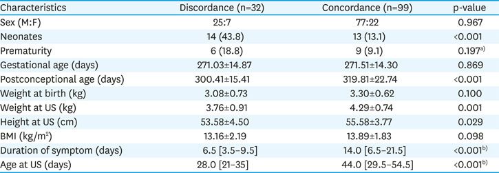 Body weight at the time of birth did not show statistically significant difference but the body weight and height at the time of US examination showed a statistical significance. Concordance group was 4.29±0.74 kg in weight and 53.58±4.50 cm in height while discordance group was 3.76±0.91 kg and 55.58±3.77 cm, respectively. However, body mass index (BMI) did not show a significant difference. The median duration of symptom was shorter in discordance group (6.5 [3.5–9.5] days) than in concordance group (14.0 [6.5–21.5] days), which had a statistical significance (p<0.001). Also, the median chronological age at the time of US was 28.0 [21–35] days in discordance and 44.0 [29.5–54.5] days in concordance groups (p<0.001).