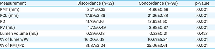 Values of PMT were significantly lesser in discordance group than concordance group (3.74±0.35 mm vs. 4.86±0.59 mm, p<0.001). Values of PCL, pyloric diameter (PD), and PV were also greater in concordance group (Table 2). Mean pyloric muscular volume was 1.72±0.49 mL in discordance group while that of concordance group was 2.98±0.87 mL. However, the values of the luminal volume were not statistically different in both groups (0.29±0.18 mL vs. 0.33±0.21 mL, p=0.423). Thus, the proportion of lumen volume to PV was significantly higher in discordance group. In discordance group, proportion of PMT in PD was 31.87%±3.24%, while it was 35.06%±3.61% in concordance group.