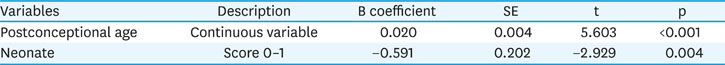 The proportions of neonates were 43.8% in discordance group and 13.1% in concordance group, which had a statistical significance (p<0.001). Although the proportion of premature patients with gestational age <37 weeks were 18.8% and 9.1% in discordance group and concordance group respectively, they did not have a statistical significance. In both groups, mean gestational age was 271 days, which could be converted to 38 weeks and 5 days. However, postconceptional age showed a difference between the 2 groups. Concordance group showed a mean of 19.4 days of older postconceptional age in days at the time of US examination, and it also had a statistical significance (p<0.001).