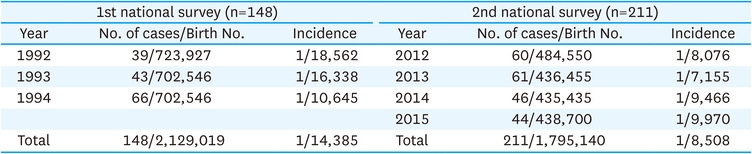 The first national survey included 69 males and 73 females, for a male-to-female ratio of 1:1.1. In the second national survey, the male-to-female ratio was 1.24:1, with 117 males and 94 females. The second national survey reported a gestational age range from 27 weeks and 3 days to 41 weeks and 5 days (mean, 37 weeks), along with a mean birth weight of 2,510 g (range, 665–4,000 g). Data on gestational age and body weight at birth in the first national survey were missing.