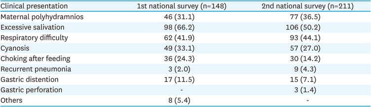 Polyhydramnios was observed in 46 (31.1%) and 77 (36.5%) pregnancies in the first and second national surveys, respectively. The most common symptom of EA/TEF was excessive salivation, reported for 98 (66.2%) patients in the first survey and 106 (50.2%) in the second survey. Other prevalent symptoms included respiratory difficulty in 62 (41.9%) and 93 (44.1%), cyanosis in 49 (33.1%) and 57 (27.0%), and choking after feeding in 36 (24.3%) and 30 (14.2%) of the cases, respectively. In the second national survey, 69 (32.7%) of the patients were diagnosed via prenatal evaluations (Table 2).