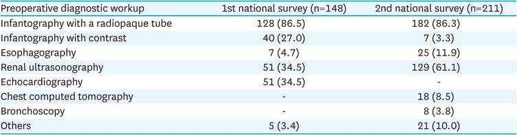 KAPS members reported on preoperative diagnostic workup methods. Infantography with a radiopaque tube and renal ultrasonography were most frequently reported, having been performed on 128 (86.5%) and 51 (34.5%) patients, respectively, in the first survey. In the second survey, these numbers were 182 (86.3%) for infantography and 129 (61.1%) for ultrasonography. In the second national survey, 18 (8.5%) patients underwent chest computed tomography, a procedure not used during the period covering the first survey (Table 3).