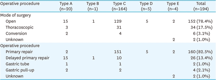 In the first national survey, 126 of 148 patients—excluding 22 patients who died or withdrew before surgery—underwent open surgery. This group included 96 (76.2%) who underwent primary repair, 13 (10.3%) who underwent delayed primary repair, and 17 (13.5%) who underwent staged repair. In the second national survey, surgical treatment methods were analyzed for 194 of 211 patients, after excluding 9 patients who died before surgery and 8 with insufficient data. Open surgery, thoracoscopic surgery, and open conversion were performed on 152 (78.4%), 34 (17.5%), and 6 (3.1%) patients, respectively. Of these, 160 patients (82.5%) underwent primary repair, 26 (13.4%) underwent delayed primary repair, 4 (2.1%) underwent gastric pull-up, and 2 (1.0%) underwent gastric tube creation (Table 6).