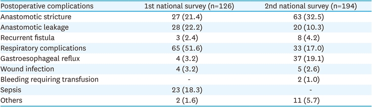 Postoperative complications included anastomotic strictures in 27 (21.4%) and 63 (32.5%) patients, anastomotic leakage in 28 (22.2%) and 20 (10.3%) patients, recurrent fistula in 3 (2.4%) and 8 (4.2%) patients, and respiratory complications in 65 (51.6%) and 33 (17.0%) patients from the first and second national surveys, respectively (Table 7).