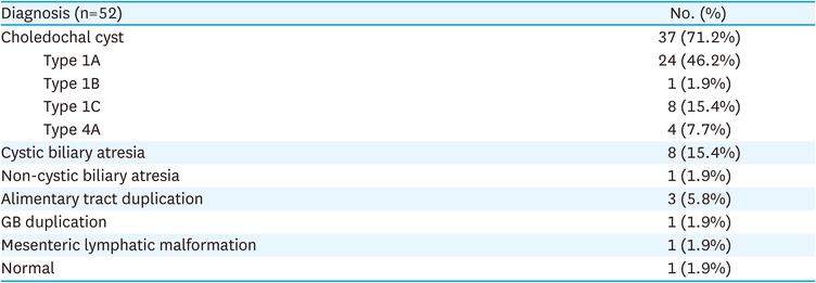 A total of 52 patients were identified to undergo surgery for perinatally detected subhepatic cyst (Table 1). Among them, CC was the most commonly diagnosed disease, accounting for 71.2% (37/52), followed by CBA at 15.4% (8/52). Alimentary tract duplications were diagnosed in 3 patients (5.8%), and non-CBA, gallbladder duplication, and mesenteric lymphatic malformation were observed in one patient each.