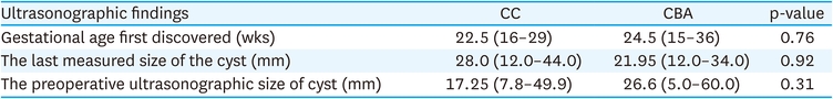 The gestational age at which cysts were initially detected on prenatal ultrasound and the size of the cysts measured at the latest assessment were compared between patients diagnosed with CC and those diagnosed with CBA (Table 3). These values did not significantly differ between the two groups. In addition, there were no differences in the cyst size measured using preoperative ultrasonography. However, ultrasound imaging or records could be used to obtain information about gestational age and latest size in only a few patients; this posed limitation in the analysis.