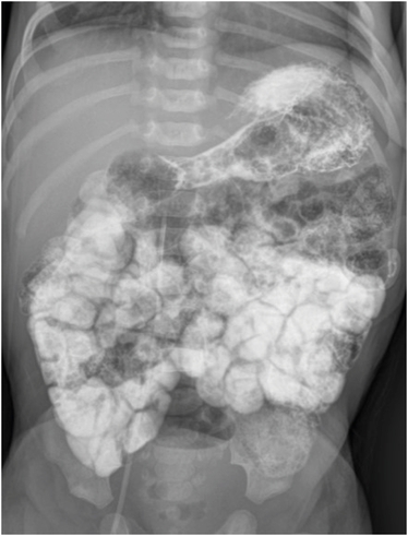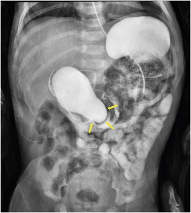 A 14-day-old male child with a history of frequent non-bilious vomiting since birth visited the emergency department. Vomiting persisted despite supportive treatments, such as positional changes and formula adjustments. The infant showed abdominal distension and had lost 5% of his birth weight. Physical examination revealed decreased skin turgor, and the patient produced only two wet diapers daily. Abdominal radiography revealed a distended stomach with some small bowel gas, while ultrasonography revealed duodenal dilatation. The upper gastrointestinal series revealed a windsock sign and a distended contrast-filled duodenum surrounded by a narrow lucent line with a small connection to the distal intestine (Fig. 1). No abnormalities were observed.