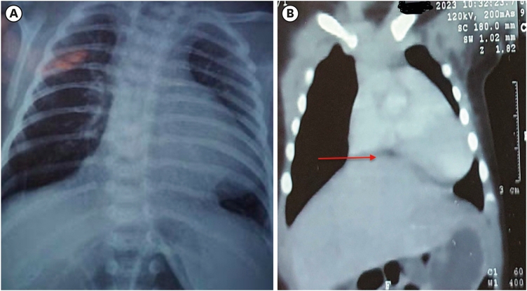 The five-week-old male child was referred to our institute for CHD with respiratory distress for one week. The child was preterm and born by cesarian section because of placenta previa and, had a smooth perinatal period, and had no complaints till four weeks of age. He suddenly developed respiratory distress and attended a local hospital where the child was intubated and kept on a ventilator. On further investigations, the X-ray chest showed an enlarged heart shadow, and echocardiography (2D echo) was reported as a hypoplastic right ventricle inlet. Afterward, he was referred to our institute for further management. After primary resuscitation, a chest radiograph was done, which depicted a slightly enlarged heart shadow and clear lung fields (Fig. 1A). A 2D echo was done, suggesting an external mass compressing on the right ventricle and possibly causing inflow tract obstruction. No other structural anomaly was detected; the right ventricular outflow tract and pulmonary pressures were normal. A CT scan was done to delineate the anatomy more clearly, which showed herniated liver tissue anterior to the pericardium and compressing it, suggesting MH (Fig. 1B).