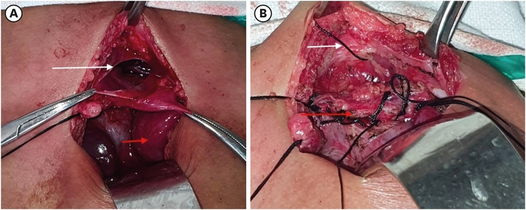 Intraoperative image. (A) An opened hernial sac (white arrow) and reduced liver content (red arrow). (B) Complete closure (red arrow) and relation with sternum (white arrow).