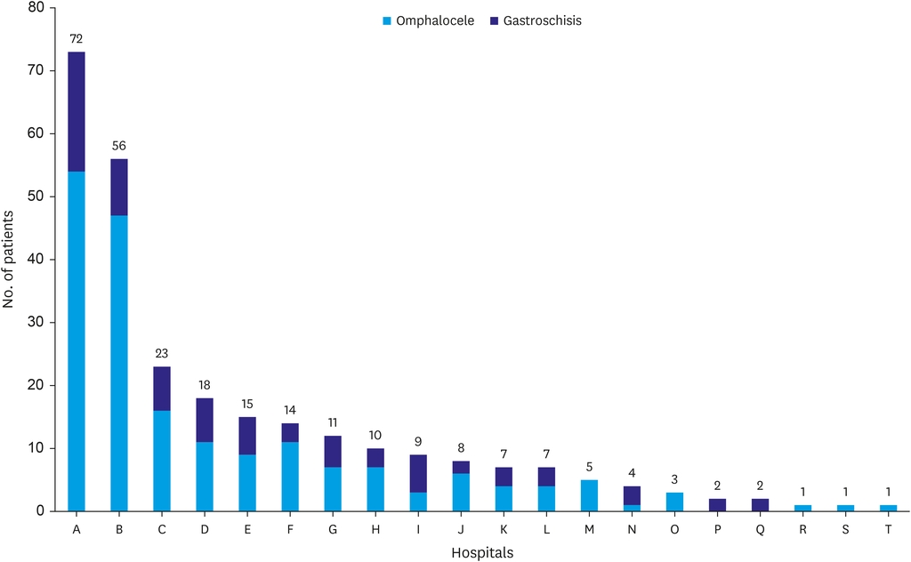 Over the 10-year period from January 2012 to December 2021, a total of 269 patients were included in the study, comprising 80 cases of gastroschisis and 189 cases of omphalocele, treated across 20 pediatric surgical centers. The distribution of patients among these hospitals varied significantly, with the top two centers managing 47.6% of all cases (Fig. 1).