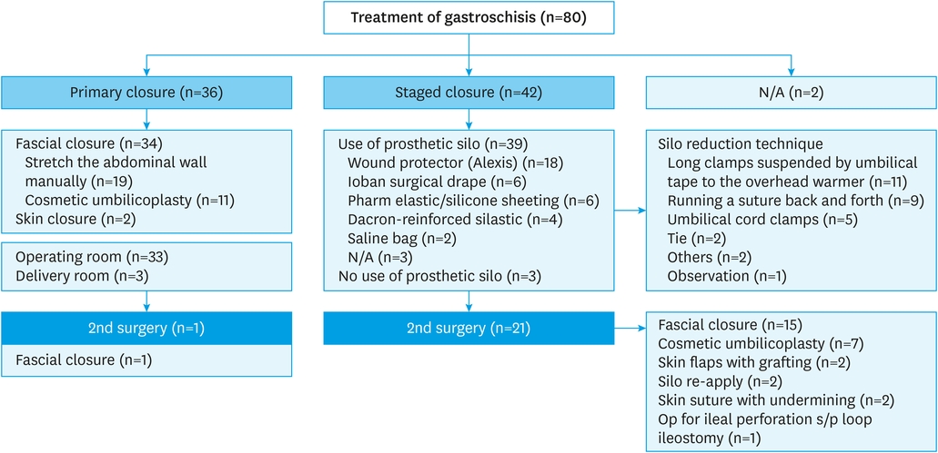 In this study, the treatment approaches for 80 patients with gastroschisis included primary closure and staged closure techniques. Comparing both treatment approaches, 42 patients underwent staged closure, 36 underwent primary closure, and 2 were not applicable. For the primary closure techniques, fascial closure was performed on 34 patients, with 19 undergoing manual stretching of the abdominal wall and 11 having cosmetic umbilicoplasty. Skin closure was performed on 2 patients. The majority of procedures were conducted in the operating room (33 cases), while 3 were done in the delivery room. For the staged closure techniques, regarding the use of a prostatic silo, 39 patients utilized it with variations such as the Alexis wound protector (18 cases), Ioban surgical drape (6 cases), Pharm elastic/silicone sheeting (6 cases), Dacron-reinforced silastic (4 cases), saline bag (2 cases), and 3 were not applicable. Three patients did not use the prosthetic silo. For cases where a prosthetic silo was used, reduction was performed using various methods such as long clamps suspended by umbilical tape (11 cases), running sutures back and forth (9 cases), umbilical cord clamps (5 cases), ties (2 cases), and other methods (2 cases). Secondary surgeries were necessary for some patients. One patient who underwent primary closure required a second surgery involving fascial closure. For 21 patients who underwent staged closure, the second surgery included additional procedures such as fascial closure (15 cases), cosmetic umbilicoplasty (7 cases), skin flaps with grafting (2 cases), re-application of the silo (2 cases), skin suturing with undermining (2 cases), and an operation for ileal perforation with subsequent loop ileostomy (1 case) (Fig. 3).