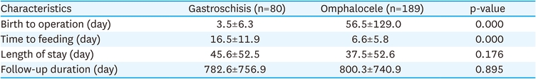 The study analyzed the clinical characteristics of 80 patients with gastroschisis and 189 patients with omphalocele. Key findings include: The time from birth to operation was significantly different between the two groups, with gastroschisis patients having an average of 3.5±6.3 days and omphalocele patients having an average of 56.5±129.0 days. Similarly, the time to start feeding was significantly longer for gastroschisis patients at 16.5±11.9 days compared to 6.6±5.8 days for omphalocele patients. The length of hospital stay was not significantly different between the two groups, with gastroschisis patients having an average stay of 45.6±52.5 days and omphalocele patients having an average stay of 37.5±52.6 days. The follow-up duration was also similar, with gastroschisis patients having an average of 782.6±756.9 days and omphalocele patients having an average of 800.3±740.9 days (Table 8).
