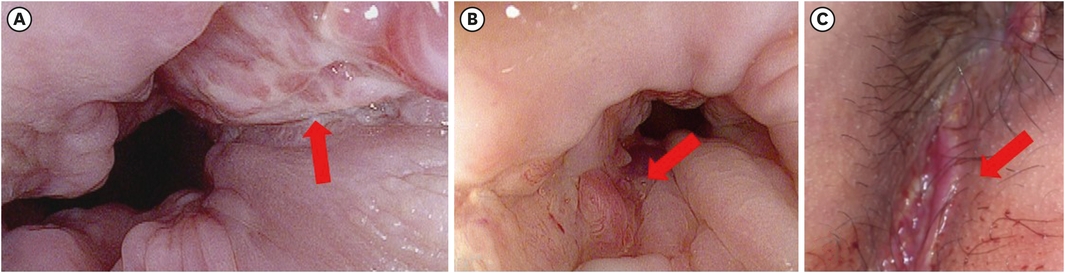 Most studies on CD-related anal fistulas simply considered the presence/absence or recurrence of anal fistulas but did not describe the characteristics of anal fistula itself. Accordingly, our findings are significant as we characterized the morphology of anal fistulas and surgical sites while investigating their relationship with CD, which could provide further insights into anal fistula pathophysiology. Fig. 1 shows the abnormal progression of wound healing at the surgical sites at 76, 101, 139, and 153 days after surgery for anorectal abscess referred from another hospital after incision and drainage. Slight recovery was observed at day 139; however, the wound worsened and did not heal. The patients were diagnosed with CD after colonoscopy. Fig. 2 shows delayed wound healing as well as friable, edematous, and granulation tissues at 57, 55, and 71 postoperative days.
