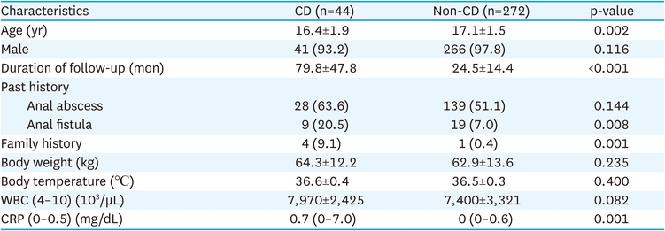 Among 316 patients who underwent surgery for anal fistula, 44 patients were diagnosed with CD (CD group), while 272 patients were not diagnosed with CD (non-CD group). Table 1 describes the patient characteristics. The mean age at diagnosis was 16.4 and 17.1 years in the CD and non-CD groups, respectively. Male patients accounted for 93.2% in the CD group, compared to 97.8% in the non-CD group. The mean follow-up duration was 79.8 and 24.5 months in the CD and non-CD groups, respectively. In the CD group, 63.6% and 20.5% had a history of anal abscess and fistula, respectively. The CD group exhibited a significantly higher incidence of patients with a history of anal fistula compared to the non-CD group (p=0.008). In the CD group, 9.1% of patients had a family history of IBD, whereas in the non-CD group, this figure was 0.4%, showing a significant difference between the groups (p=0.001). There was no significant between-group difference in body weight, body temperature, and white blood cell (WBC) count. The level of C-reactive protein (CRP) was 0.7 (0–7) in the CD group and 0 (0–0.6) in the non-CD group, demonstrating a significant difference between the groups (p=0.001).