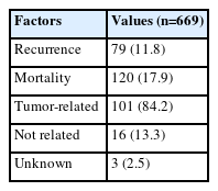 Of the 669 patients, 79 (11.8%) experienced recurrence. During the median 69.4-month follow-up period, 120 patients (17.9%) died. Out of them, 101 deaths were tumor-related, and 16 were not directly related to the tumor (