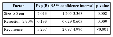 Table 4). Size at diagnosis larger than 5 cm was associated with a 2.013 times higher risk than size at diagnosis less than 5 cm (95% confidence interval [CI], 1.205–3.363). Recurrence was the independent prognostic factor (hazard ratio [HR], 3.237; 95% CI, 2.097–4.996). Greater than or equal to 90% resection was a protective factor (HR, 0.133; 95% CI, 0.029–0.603).
