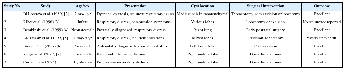 Table 1.Previously reported cases of intrapulmonary bronchogenic cysts in infants